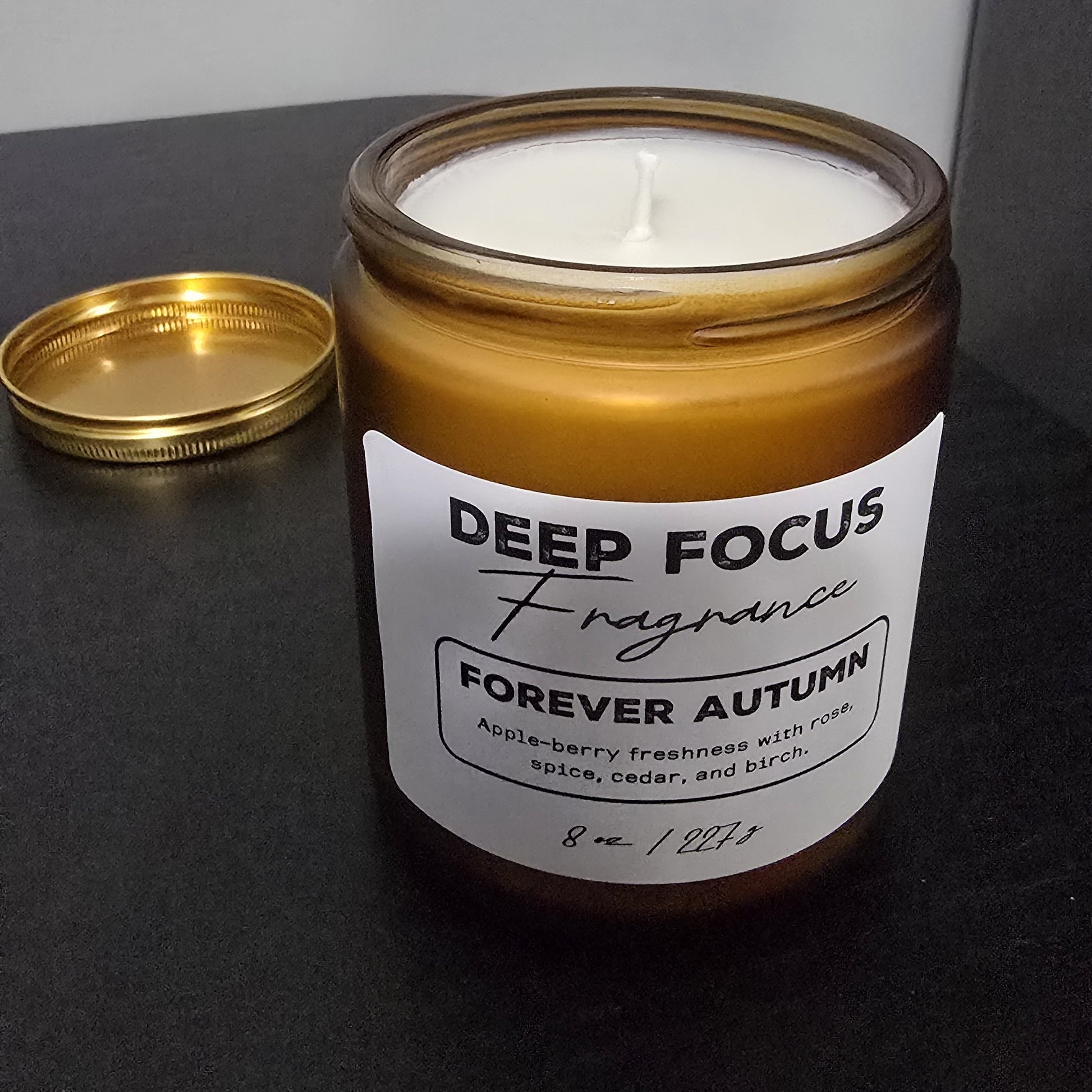 Forever Autumn opens with crisp apple, lush berries, and leafy green accents—a vibrant autumn introduction. It blooms into a floral heart of tea rose and chrysanthemum, warmed by cinnamon, clove, and birch wood for a subtly spicy, comforting embrace. Finally, the scent settles into a serene base of cedar and musk, grounding the experience with woodland depth. This candle lifts deskwork into focused clarity with its bright yet balanced aroma, then drifts into soothing calm as evening falls. From productivity to peaceful repose, Forever Autumn carries you through the season’s gentle rhythm.